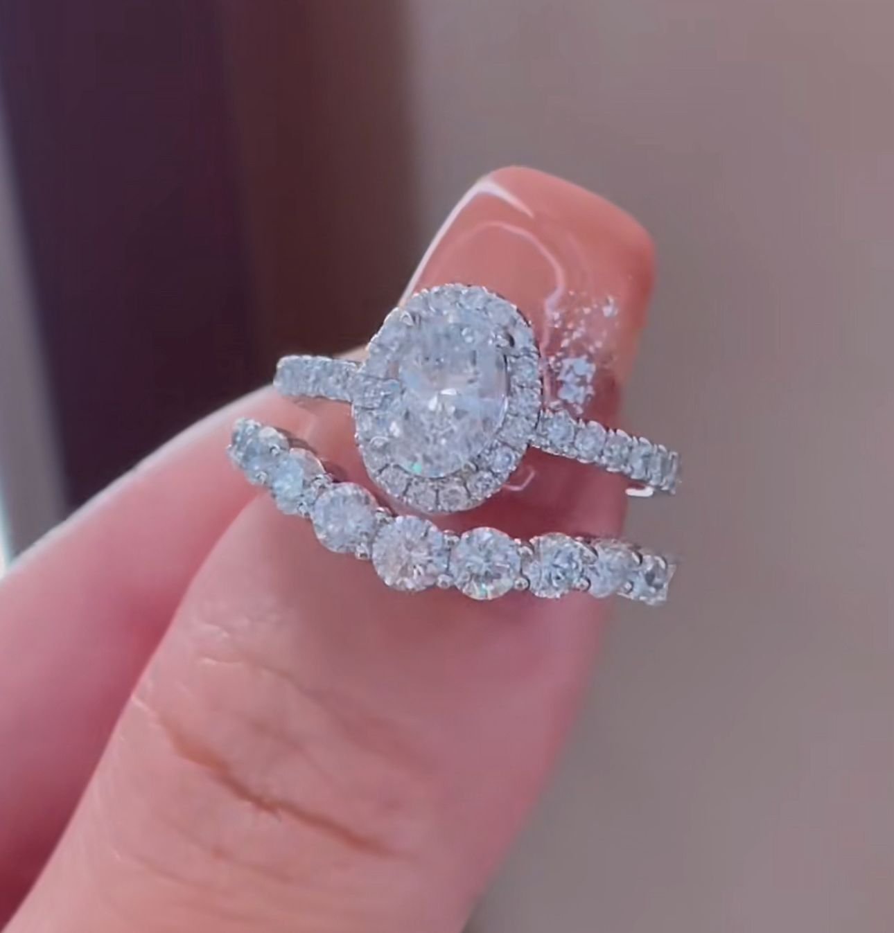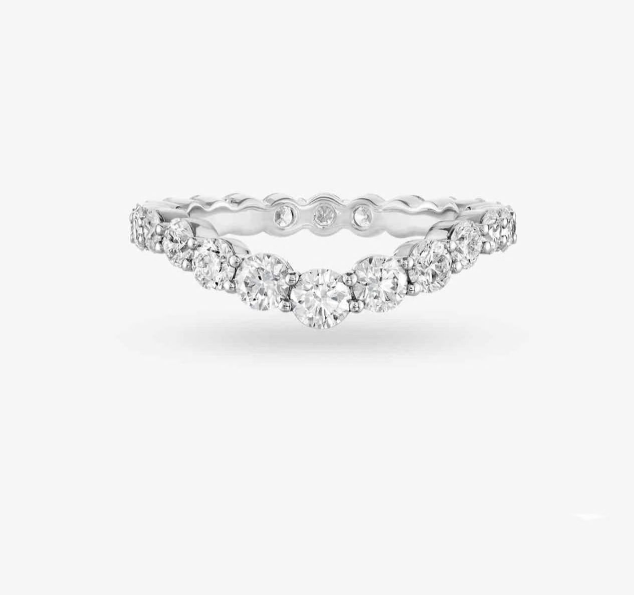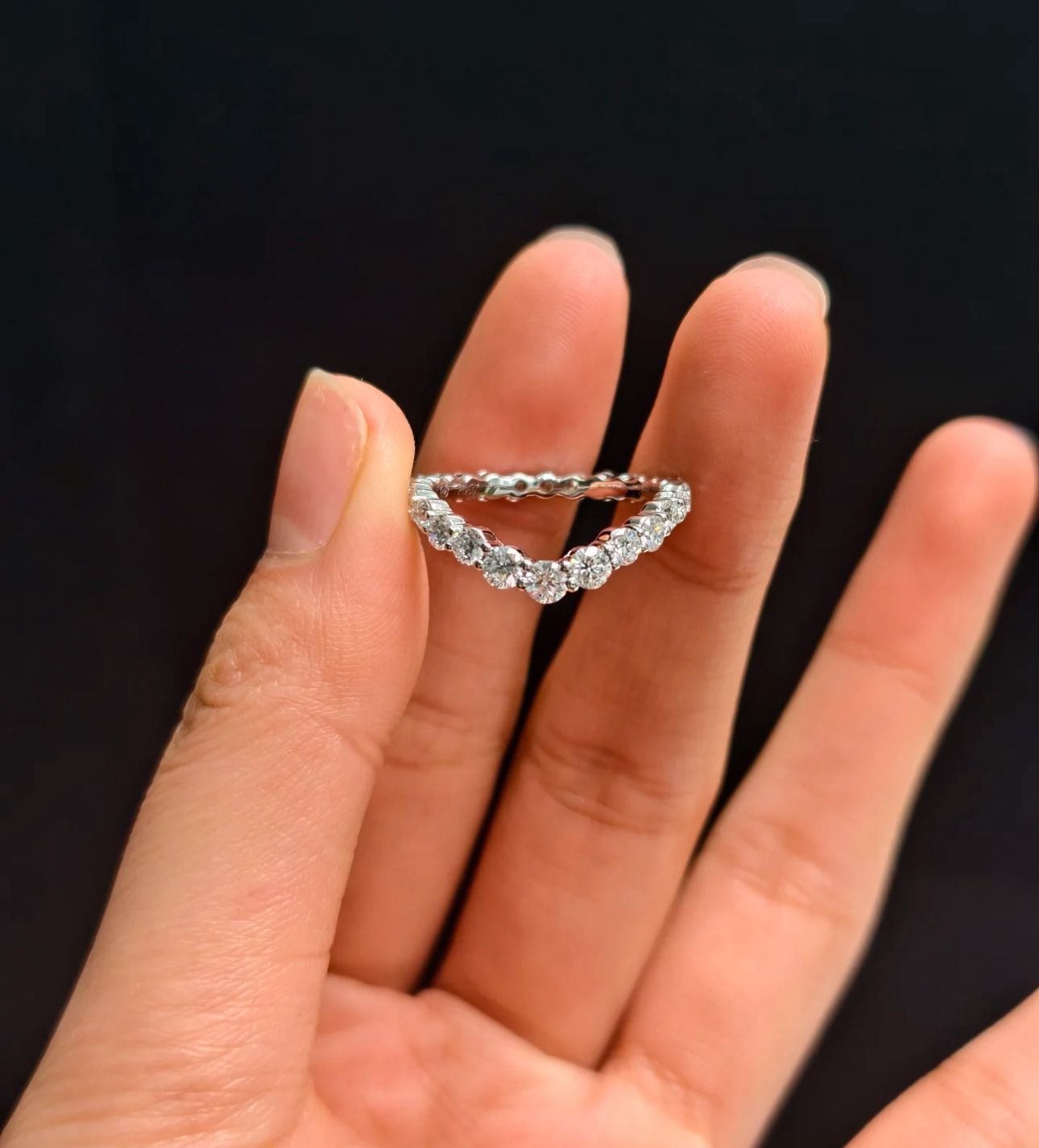 ⇒ Band Style: Sleek platinum with a subtle V-shape, ensuring comfortable stacking and sophistication.